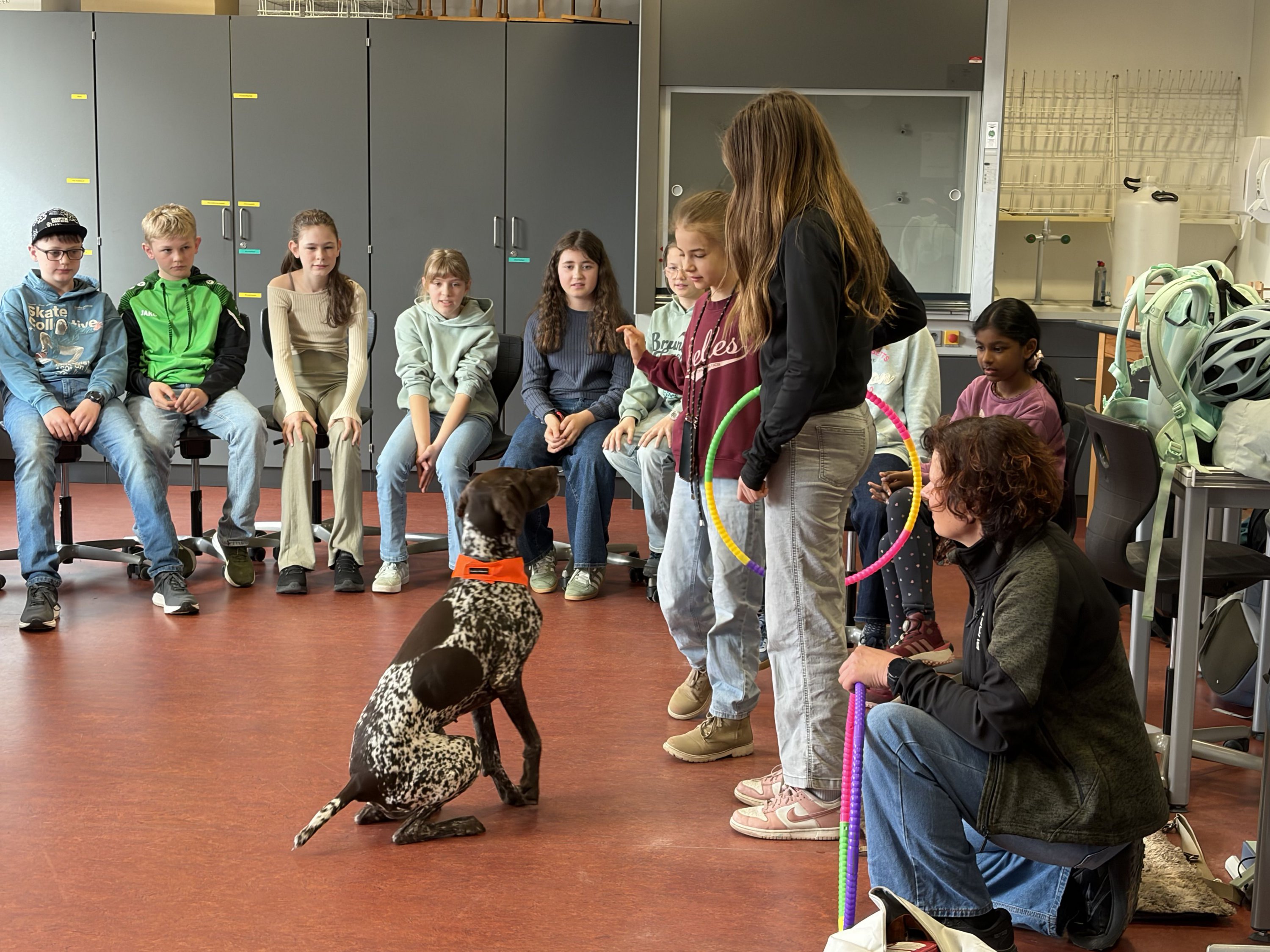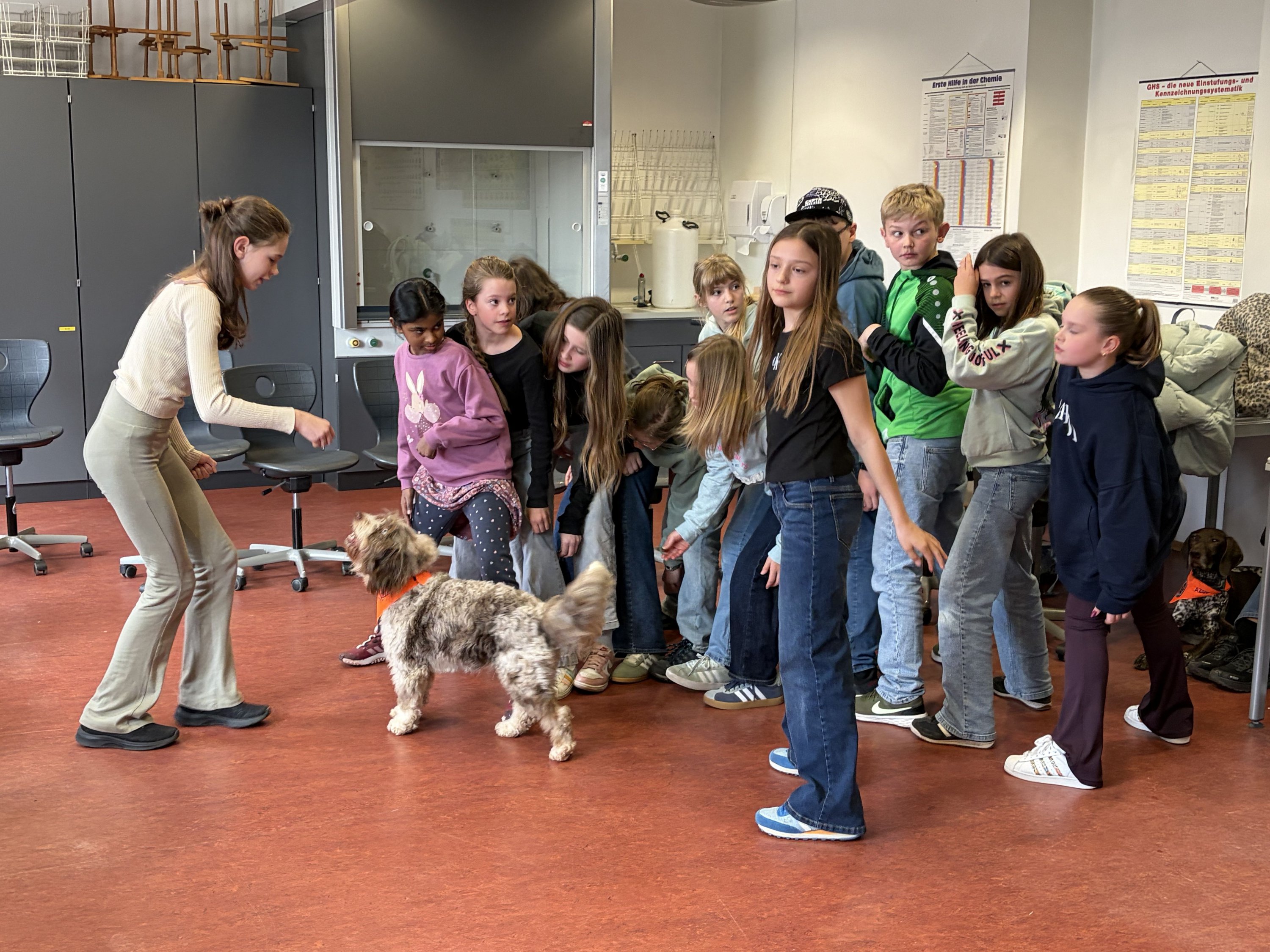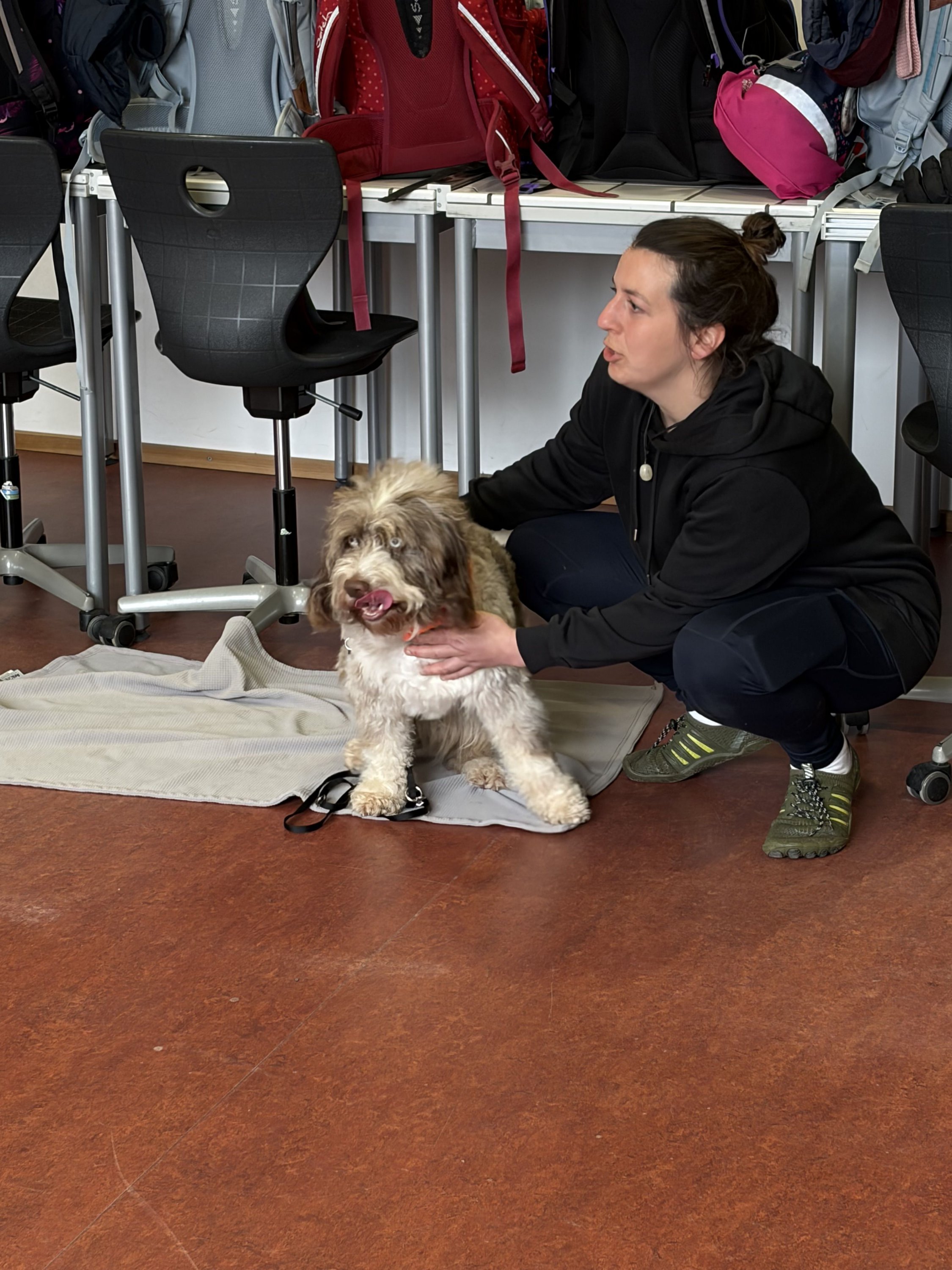 Für die angehenden Therapiehunde ist es wichtig, Alltagssituationen realistisch zu erleben. Deshalb fand der Besuch bewusst im laufenden Schulbetrieb statt. Die Hunde konnten in Kontakt mit Schülerinnen und Schülern treten, verschiedene Geräusch- und Bewegungssituationen kennenlernen und ihr ruhiges, freundliches Verhalten unter Beweis stellen.