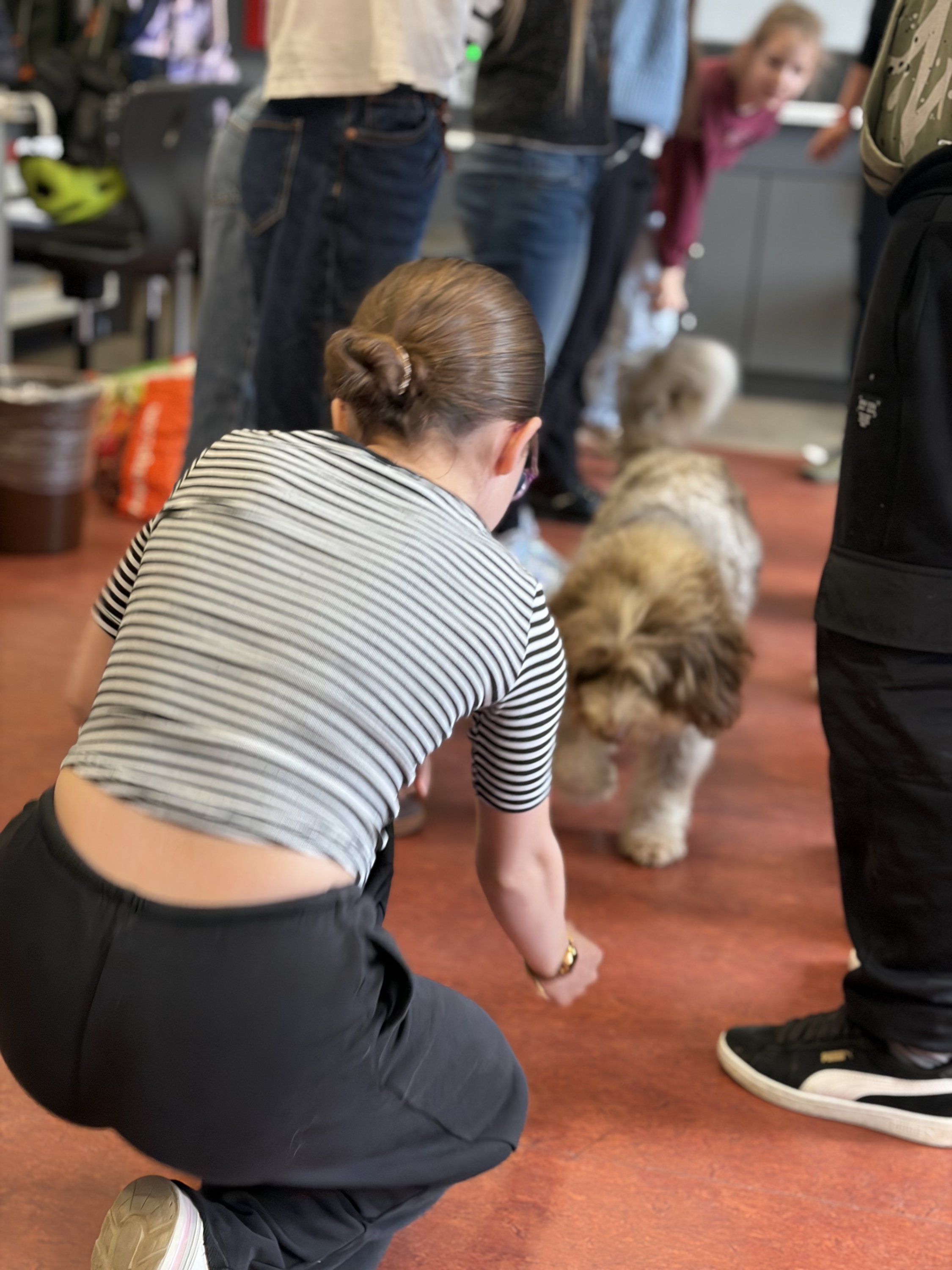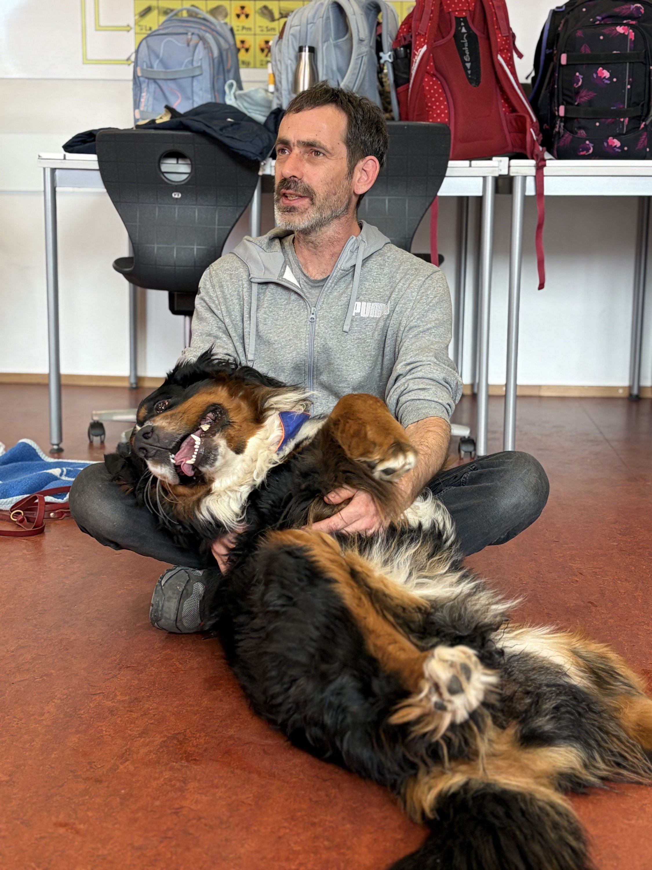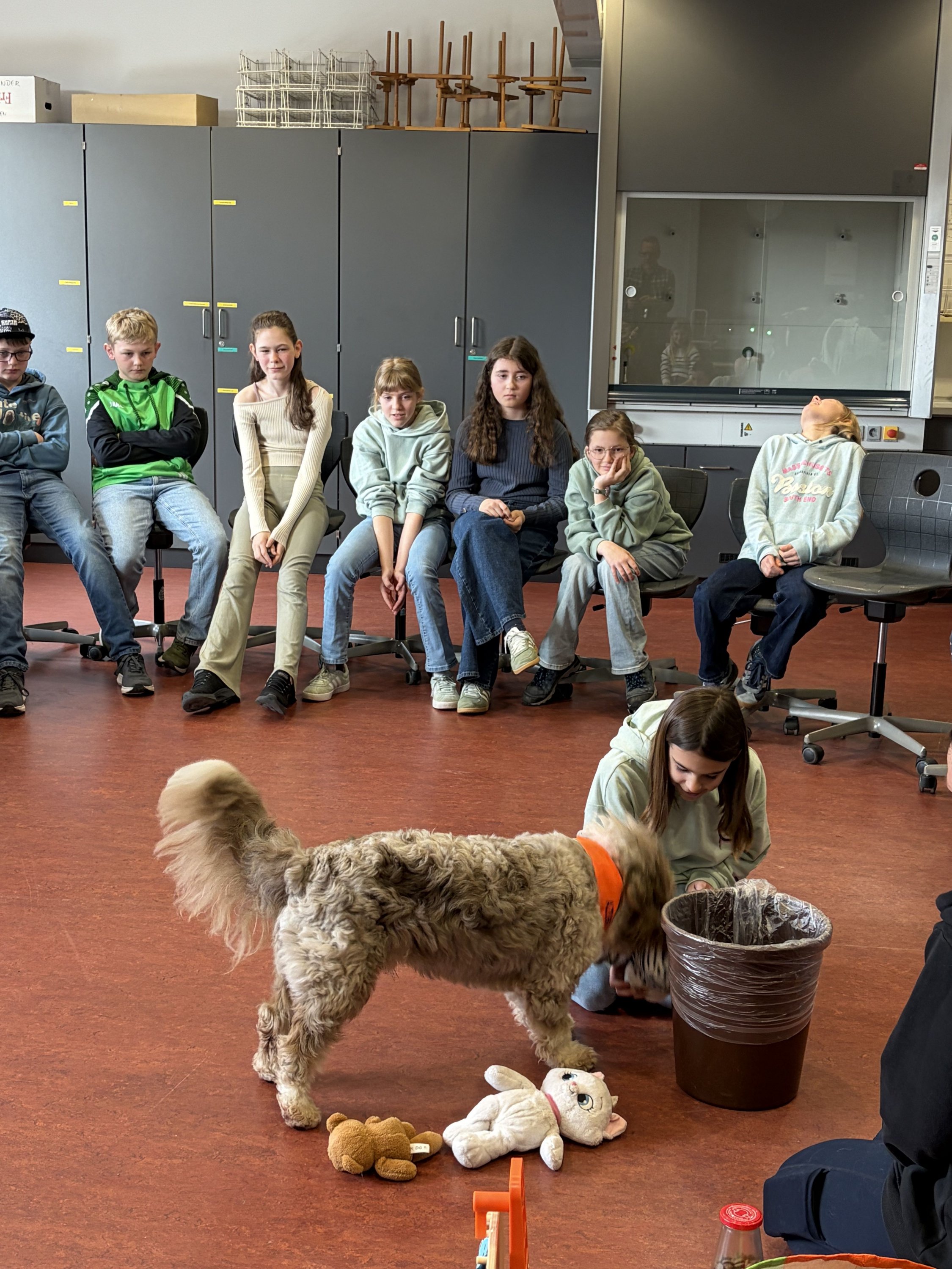 Für die angehenden Therapiehunde ist es wichtig, Alltagssituationen realistisch zu erleben. Deshalb fand der Besuch bewusst im laufenden Schulbetrieb statt. Die Hunde konnten in Kontakt mit Schülerinnen und Schülern treten, verschiedene Geräusch- und Bewegungssituationen kennenlernen und ihr ruhiges, freundliches Verhalten unter Beweis stellen.